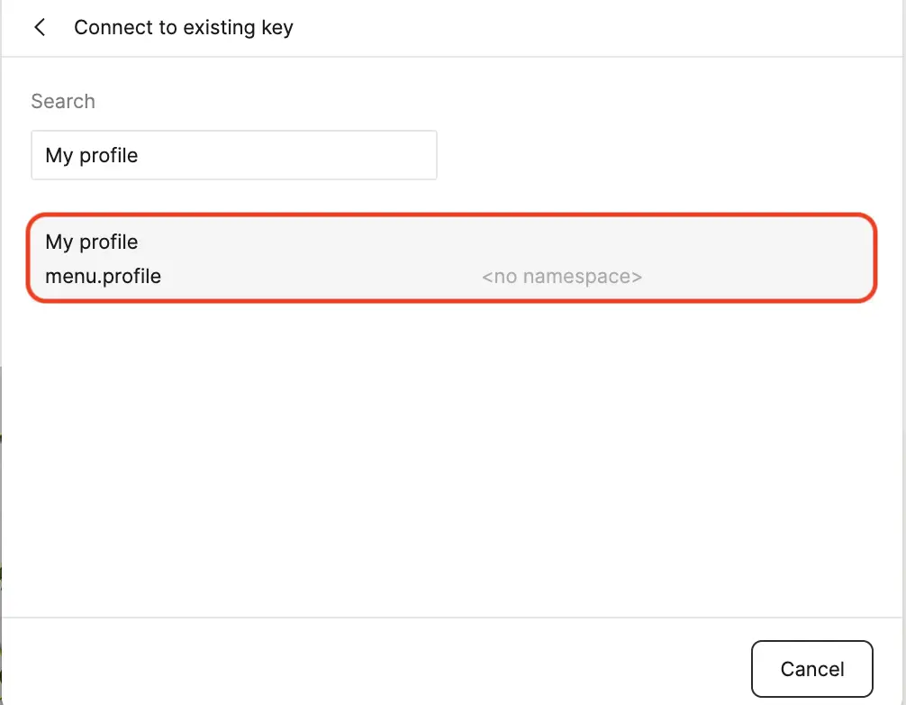 Second, select a key from the list of keys that you want to connect the text to. You can edit the text in the Search field to find any key in Tolgee. After you connect an existing key to the text, the "link" icon will be darker (or lighter when using the Dark theme).